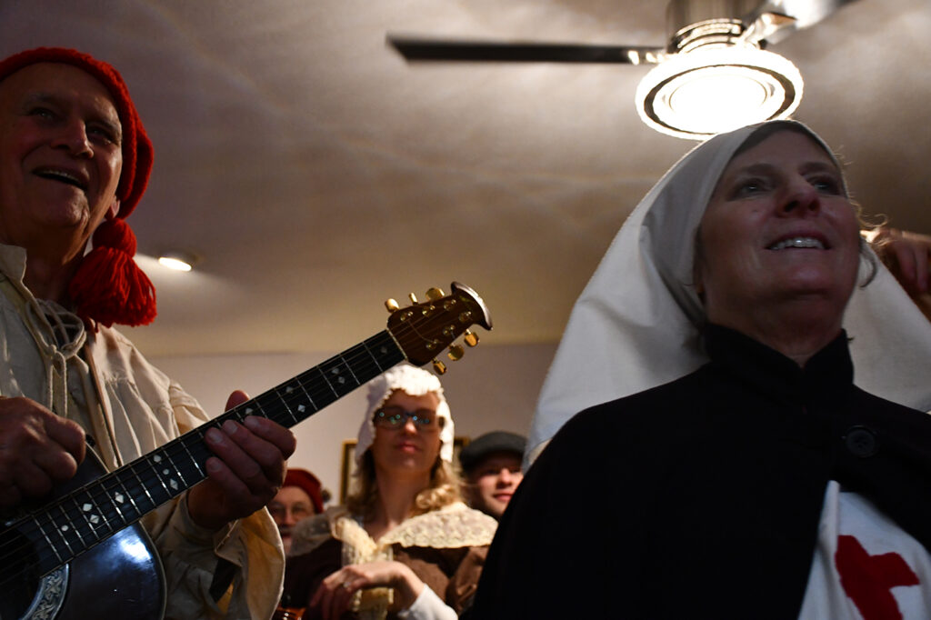 Musical Instruments as Props – Participants carry fiddles, guitars, accordions, and other instruments that both provide musical accompaniment and serve as visual indicators of the revelers’ identity—these are traveling musicians, troubadours, performers demanding welcome at each stop.