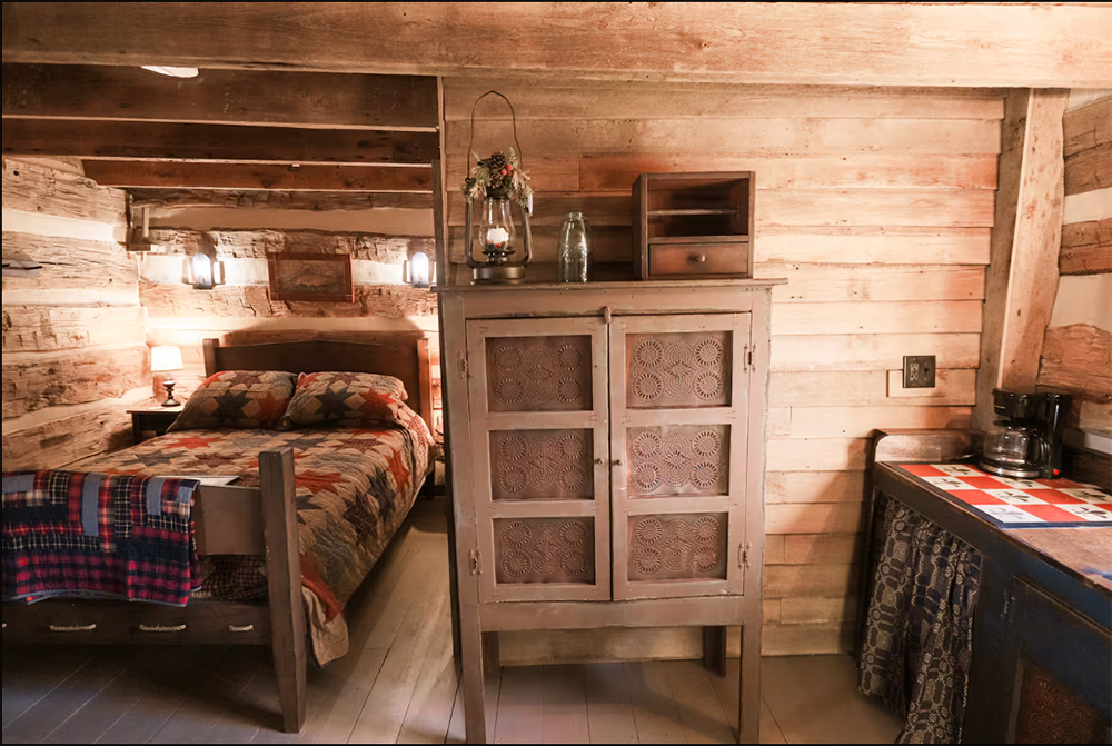 Most historic lodging involves staying in renovated buildings where modern amenities awkwardly coexist with period architecture—exposed beams above recessed lighting, original fireplaces beside flat-screen TVs, antique exteriors wrapped around thoroughly contemporary interiors. Sassafras Creek Cabin takes different approach: this circa 1840 log cabin, relocated to its current St. Marys Road property in June 2020 and featured in Season 1, Episode 3 of Restoration Road (streaming on Max), offers genuinely immersive historical experience where furniture, decor, and atmosphere authentically match the cabin’s time period. You’re not sleeping in building that merely looks old from outside while functioning like standard rental inside. You’re inhabiting space that feels genuinely transported from the 1840s—stepping back in time to experience what frontier cabin living actually meant, albeit with crucial modern comforts (climate control, proper plumbing, reliable electricity) that make the experience enjoyable rather than merely authentic.