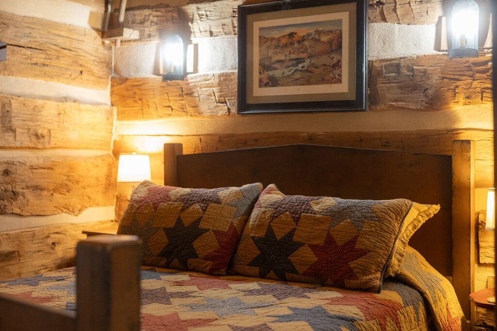 - Log cabin construction visible in walls, exposed beams, authentic materials