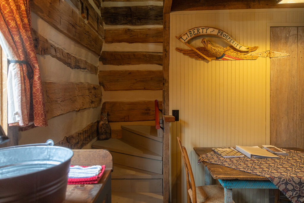 Sassafras Creek Cabin distinguishes itself through commitment to period-appropriate furnishing and decor. This isn’t log cabin with random antiques scattered among IKEA furniture and contemporary amenities. This is carefully curated interior where furniture, textiles, lighting, cooking implements, and decorative elements authentically reflect 1840s frontier domestic life.